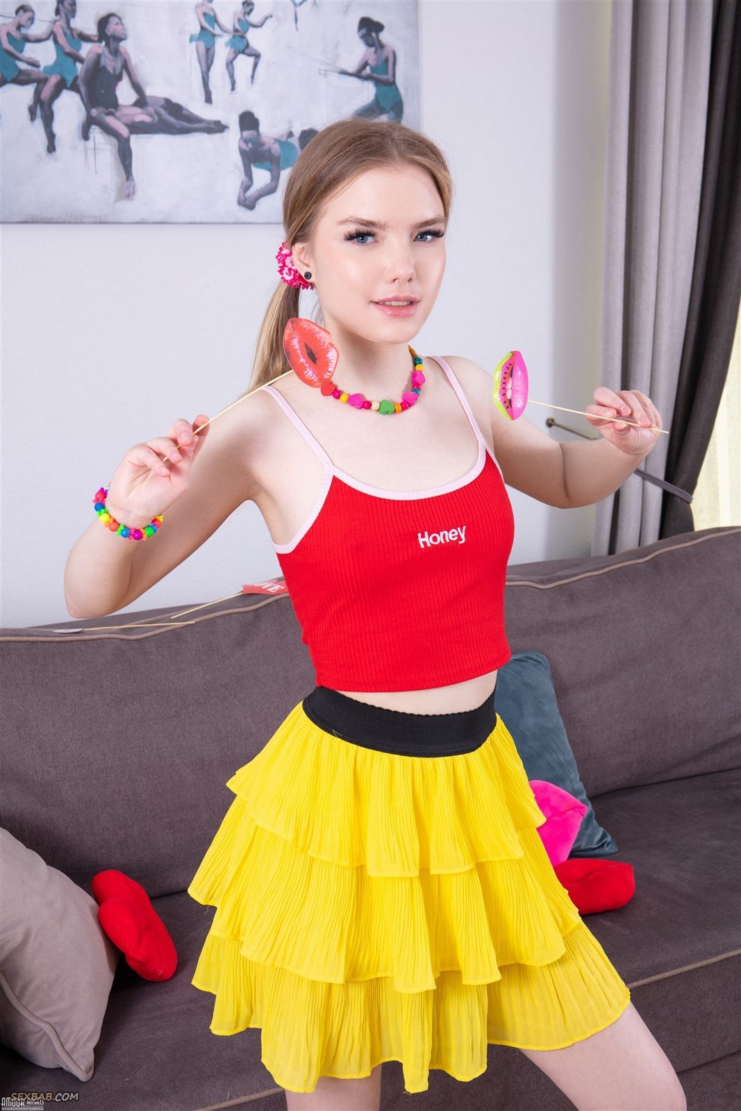 Описание: Игривая молодая куколка в майке и короткой юбке решительно сняла их с себя вместе с трусами и оголила на камеру бритую писю. Затем обнаженная детка с маленькой грудью принялась похотливо извиваться всем телом на диване и с разных ракурсов демонстрировать нам между ног свою большую сочную пиздёнку.