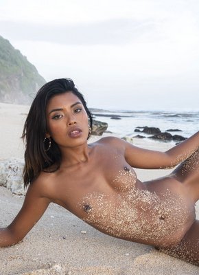 Описание: Чувственно извиваясь всем телом на горячем песке и постепенно снимая перед камерой короткое платье, эротическая темнокожая модель с миниатюрными титечками развратно позирует обнаженной на пляже и, совершенно ничего не скрывая от нас, бесстыже раскрывает свою бритую темную пизду.