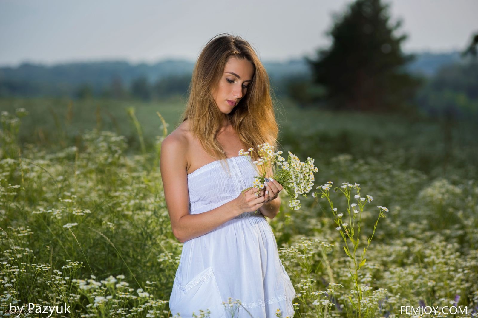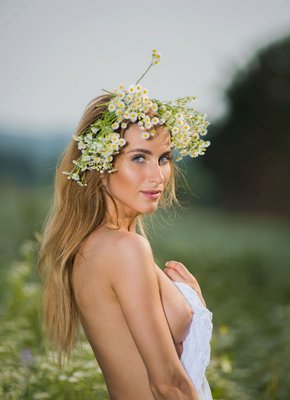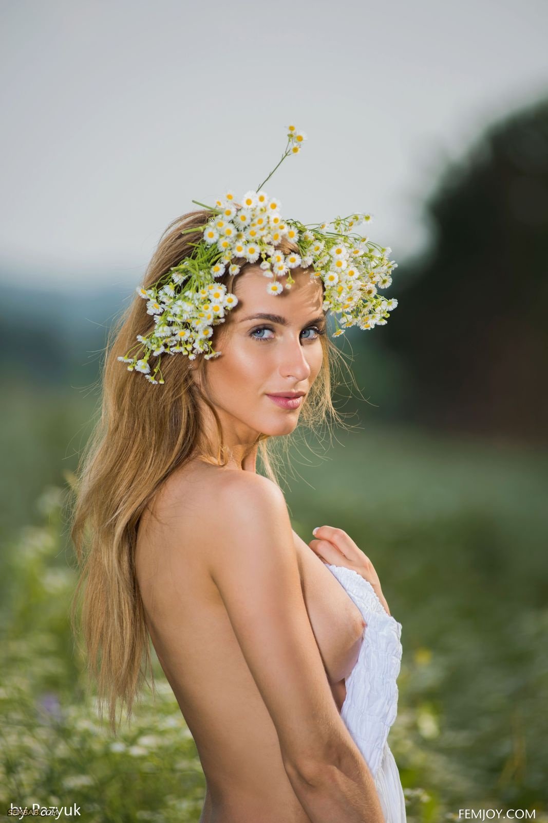 Описание: Игриво позируя перед камерой с цветочным венком на голове, деревенская белобрысая красотка разделась до гола прямо в поле. Выставив на показ свое стройное сексуальное тело, горячая красотка с натуральными упругими сиськами удобно устроилась на стуле с широко раздвинутыми ногами, развратно выпятив вперед голую бритую промежность.