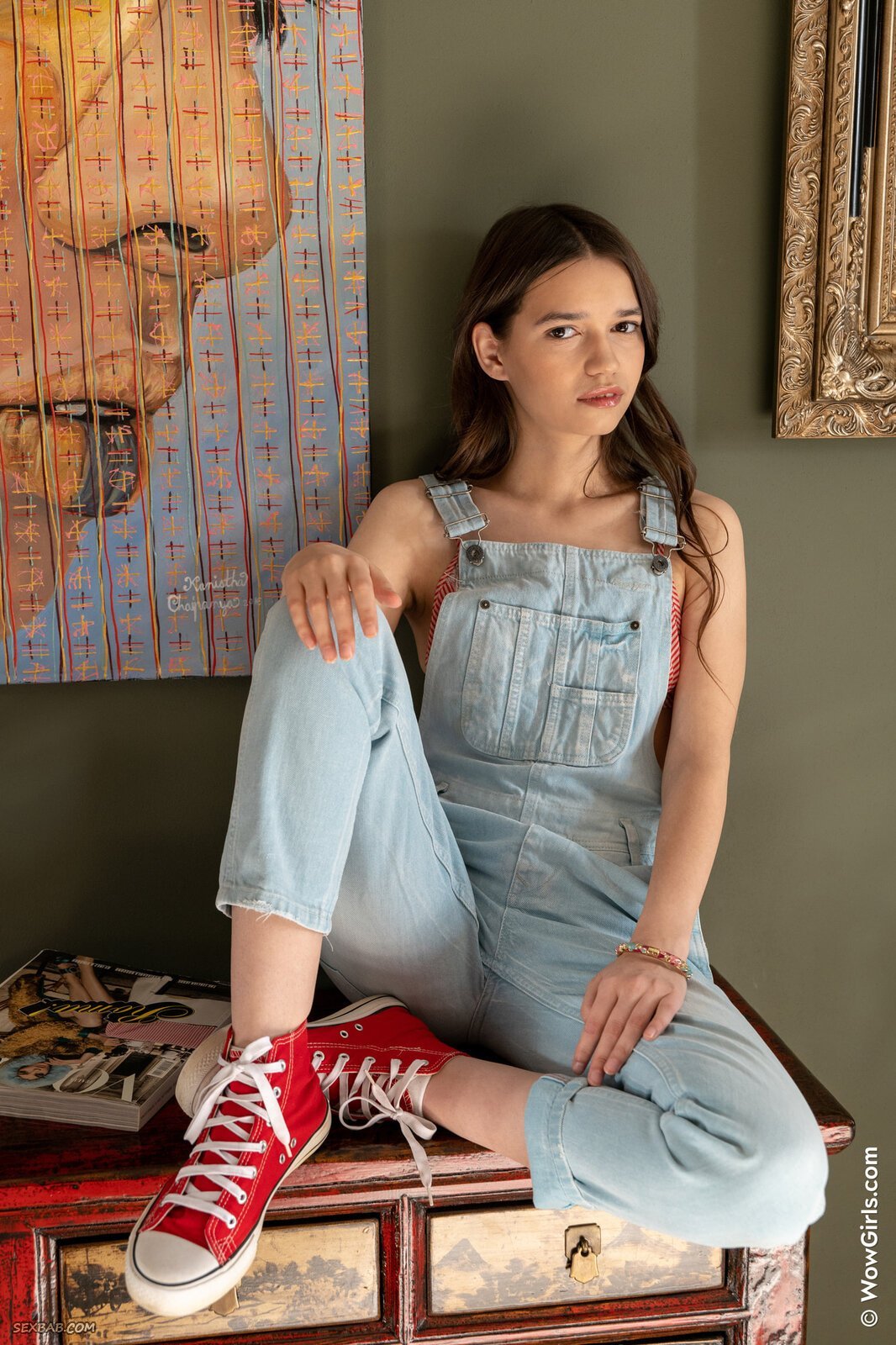 Описание: Молодая скромная милашка в джинсовом комбинезоне и кружевном белье медленно разделась до гола, медленно оголяя свое нежное худое тело. Голая детка с маленькими плоскими титьками и коричневыми сосками эротично позирует на полу и с разных ракурсов засвечивает на камеру свою бритую мягкую писю.