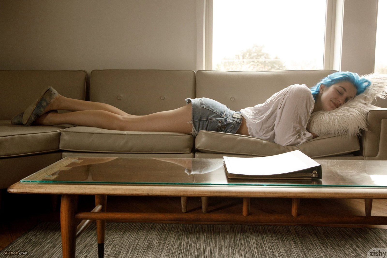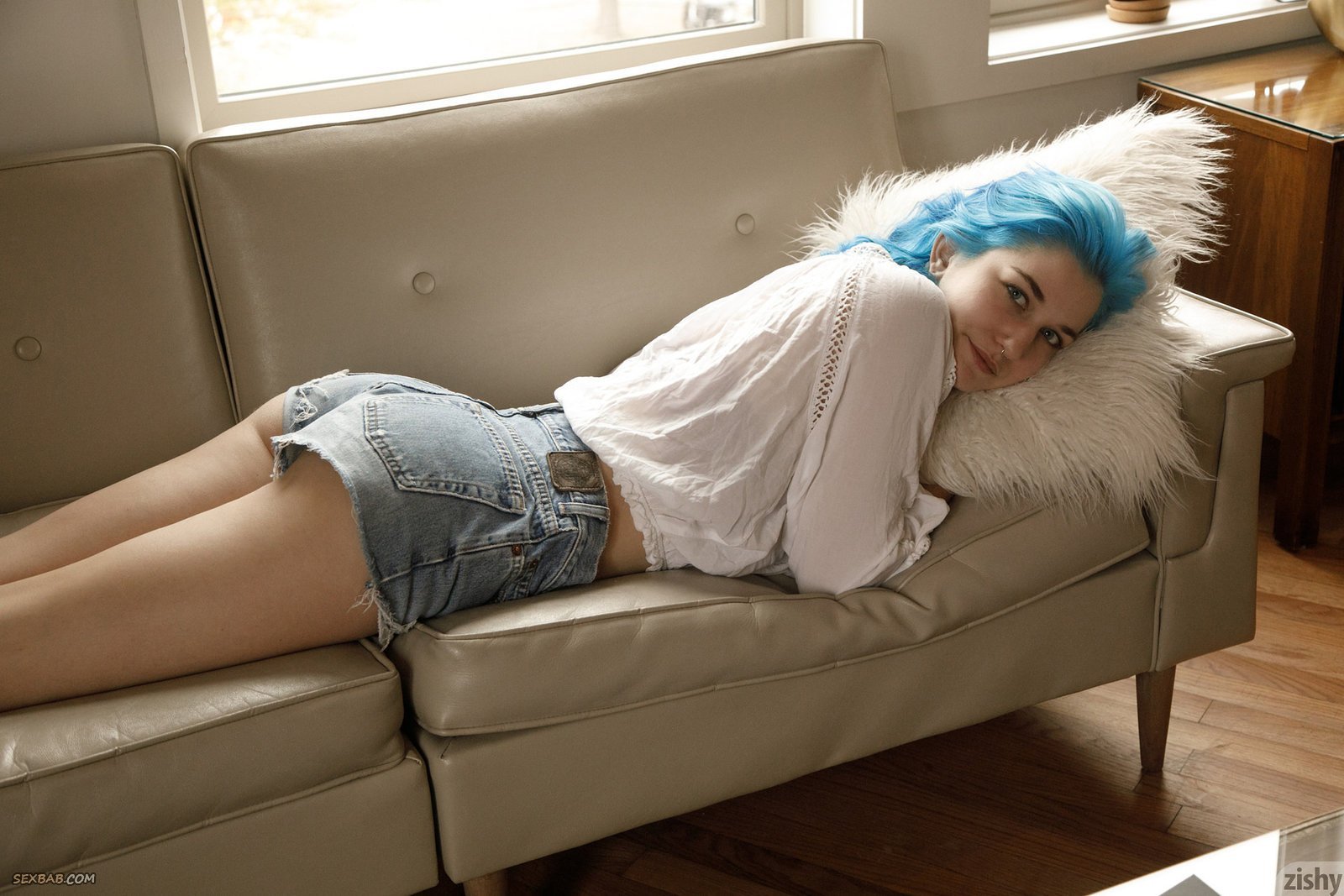 Описание: Не обременённая излишней скромностью неформалка с голубыми волосами в коротких шортах и блузке берется эротично позировать дома, с радостью демонстрируя перед нами голые большие натуральные титьки с пирсингом в сосках. Ощущая растекающееся по её телу возбуждение, распутная девушка порой поджимала ноги и засвечивала промежность с ляжками.