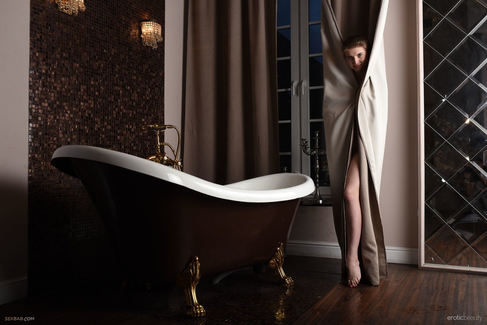 Описание: Сексуальная молодая красотка с полностью обнаженным телом и натуральными сиськами моется в ванне, а между тем эротично позирует и часто меняет разные ракурсы. Лежа в теплой воде, сексуальная девушка чаще всего оттопыривала красивую задницу вставая раком, а так же раздвигала ноги, что позволяло ей показать бритую письку.