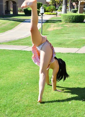 Описание: Прогуливаясь по улице, очаровательная брюнетка невысокого роста в сарафане принимается чередовать разные позы, засвечивая попку в трусиках под юбкой. В будущем молодая красотка возвращается домой, где медленно оголившись устраивается в постели и проникает в бритую письку необычными предметами, ощущая удовольствие и возбуждающе открывая рот.