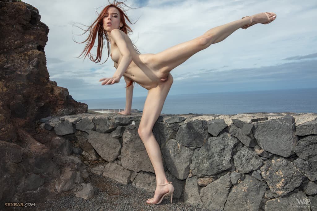 Описание: Найдя уединенное место, тощая рыжая сучка в желтом костюме хочет расслабиться и, чтобы ничего ей не мешало, танцует голой. Девушка грациозно и изящно поднимает свои длинные ноги так высоко, что хорошо видно ее голую бритую киску, а затем она с удовольствие засовывает в нее свои длинные влажные пальчики.
