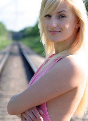 Описание: Прогуливаясь по рельсам, очаровательная блондинка в короткой юбке и туфлях на высоком каблуке старается эротично позировать и мило улыбаться. В дальнейшем же, когда сексуальная девушка разделась до гола, можно было во всей красе рассмотреть её плоские сиськи и бритую письку.