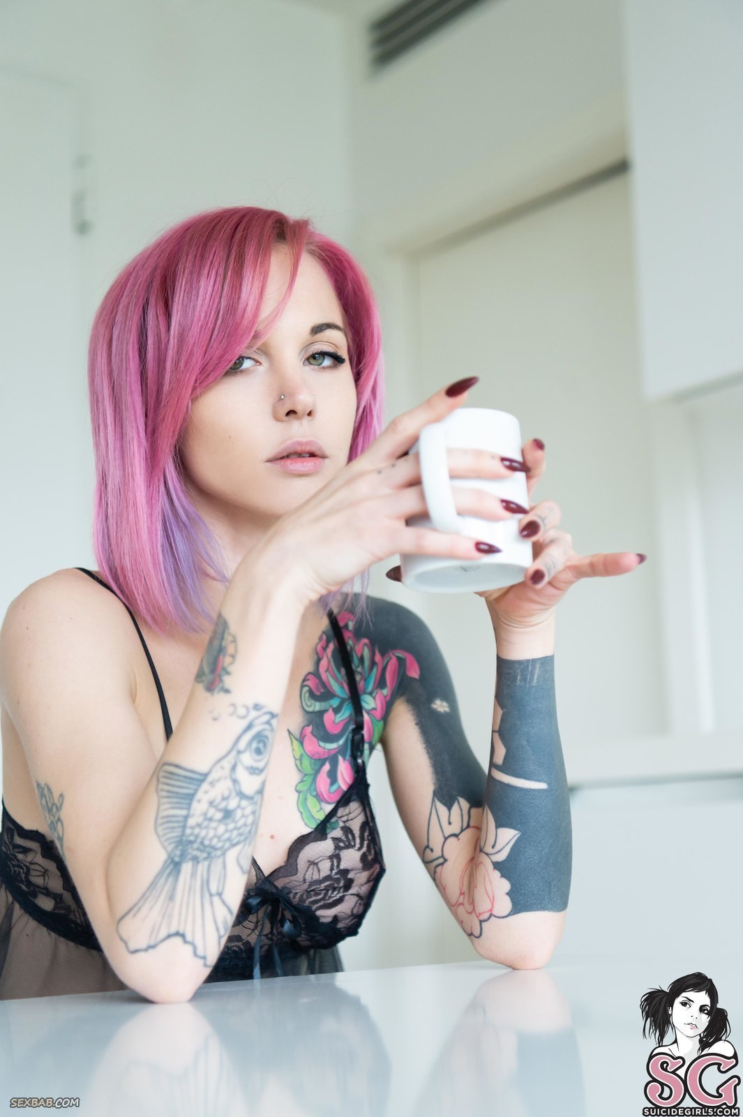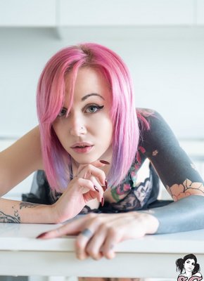 Описание: Сексуальная красавица в татуировках эротично позирует на кухне и забираясь на стол оголяет упругие сиськи с торчащими сосочками. Меняя разные ракурсы, горячая сучка с яркими розовыми волосами так же порой акцентировала внимание на бритой письке, которая виднелась через приспустившийся пеньюар.