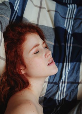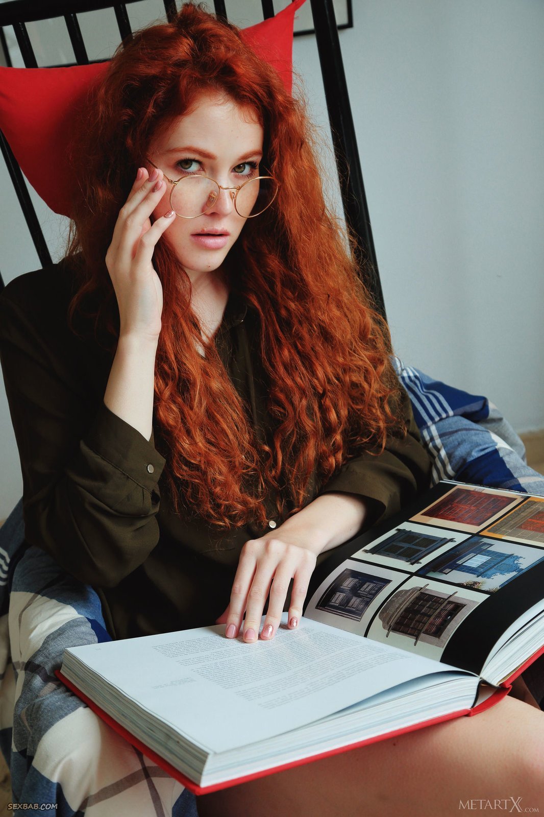Кудрявая рыжеволосая стройняшка с бритой щелкой