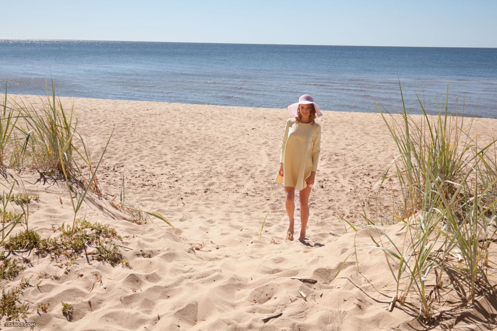 Очаровательная девка в шляпке оголяет попу на пляже