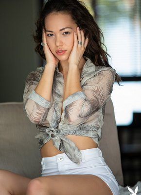 Модель в коротких шортах раздевается дома